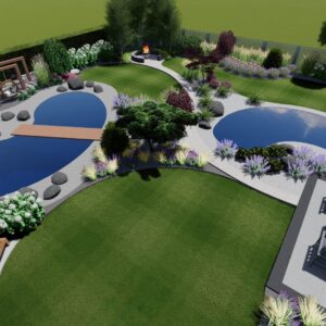 Ciekawym elementem kompozycji tego ogrodu jest przede wszystkim miejsce na palenisko z betonową okrągłą ławeczką w otoczeniu małego lasku brzozowego. Dla inwestorów ważnym aspektem było rozmieszczenie strefy gospodarczo-sadowniczej, ścieżek komunikacyjnych po ogrodzie jak również bruk w strefie frontowej z płyt wielkogabarytowych. Wszystkie wymagania zostały spełnione, a dodatkowo powstały ogród został zaprojektowany tak, żeby był funkcjonalny i łatwy w obsłudze.