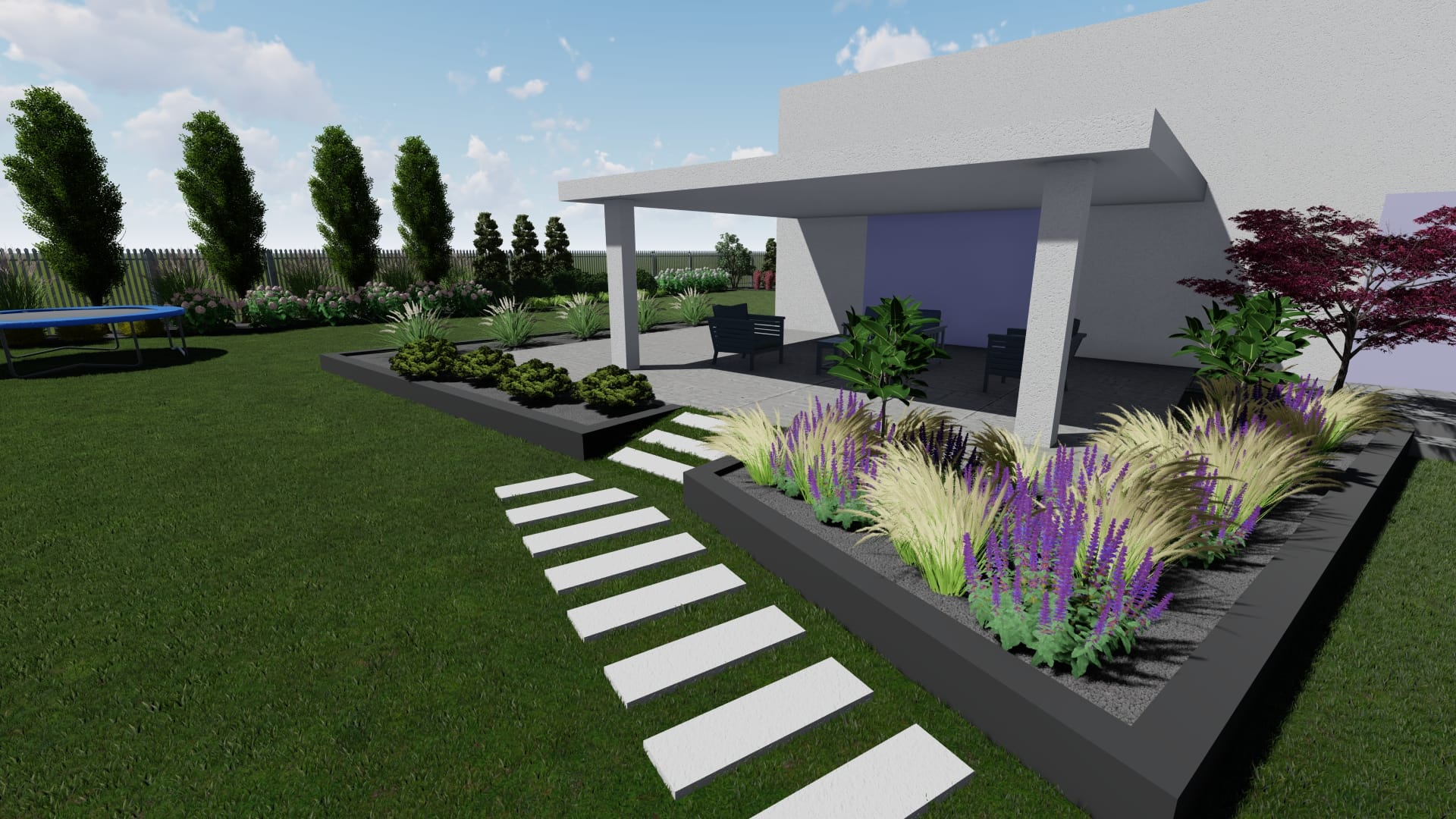Opis projektu: główną ideą projektu ogrodu w Inwałdzie było zagospodarowanie niewielkiej powierzchni terenu w sposób niepowtarzalny i ciekawe. Aranżacja małego ogrodu musi być dopracowana w najmniejszych detalach. Dlatego też zdecydowaliśmy, że koncepcja główna założenia będzie bazowała na formach geometrycznych - trójkątach, które w ciekawy sposób podzielą przestrzeń na miniaturowe krajobrazy. Podkreśleniem nowoczesności są tutaj betonowe płyty chodnikowe, palisada w kolorze antracytowym oraz rośliny. Najistotniejszym punktem projektu był właśnie kształt całej kompozycji oraz odpowiedni dobór gatunków roślin. Nastrój ogrodu będą podkreślać przede wszystkim lawendy wąskolistne, białe hortensje, szpaler buków, sosny, derenie oraz wszelkiego rodzaju trawy ozdobne.