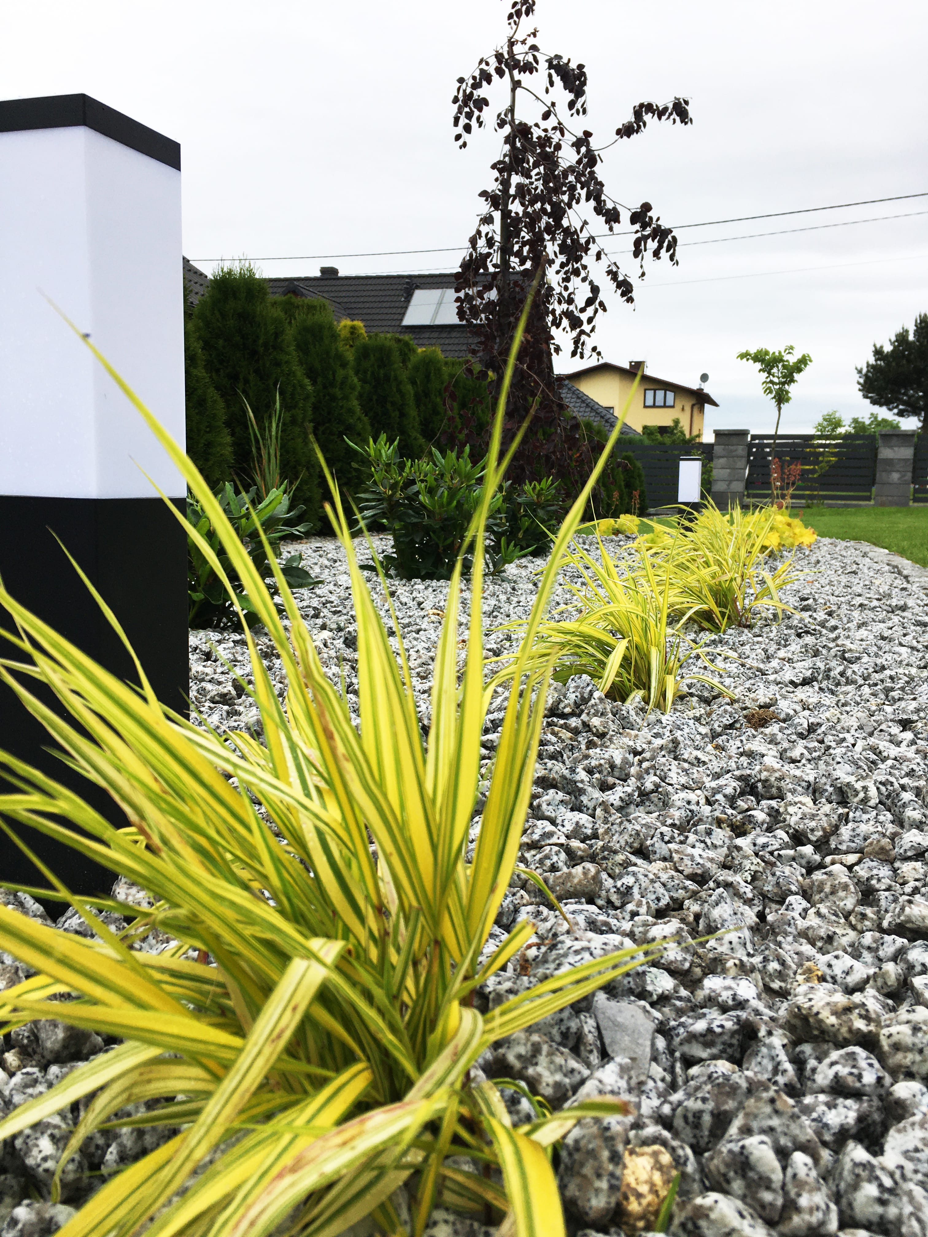 Opis projektu:głównym elementem dekoracyjnym strefy frontowej jest uformowany bonsai z cisa, który zdobi strefę przy drzwiach wejściowych. Problematycznym punktem w tym miejscu były dwie studnie, które zaburzały efekty wizualne. Rozwiązaniem stała się rabata którą otacza niski żywopłot z cisa wraz z sześcioma żywotnikami szczepionymi na pniu oraz płożące runianki. Całość kompozycji dopełnia podwyższona donica z palisady, gdzie zostały posadzone hortensje oraz kule bukszpanowe.